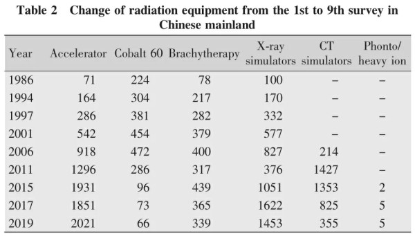 本次视察显示中国大陆地区放疗装备数目一连增添,,,,,,共有直线加速器2,021台(含入口和国产),,,,,,钴60远距离治疗机66台,,,,,,近距离治疗机339台,,,,,,质子、重离子机5台,,,,,,通例模拟机1,453台,,,,,,CT模拟机355台。。。能开展二维放疗1,002家,,,,,,详见表2(Table 2)。。。